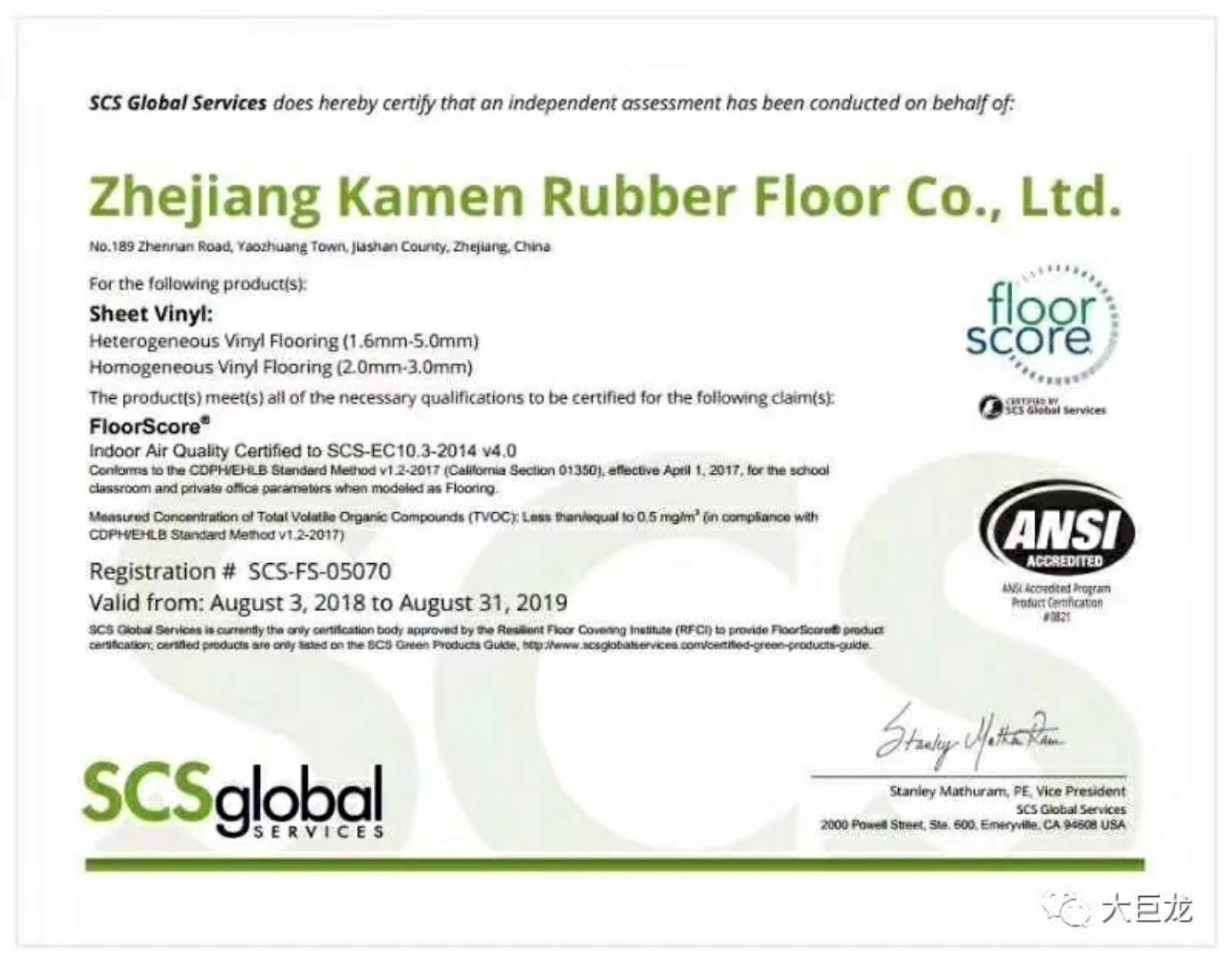日前,大巨龍pvc地板廠家又獲得一個“新簽證”。歷經幾個月嚴謹現場審核、產品抽樣檢測和資料審查,大巨龍集團旗下PVC復合地板和同質透心地板均順利通過美國科學認證體系(SCS)評價并獲得FloorScore認證證書。