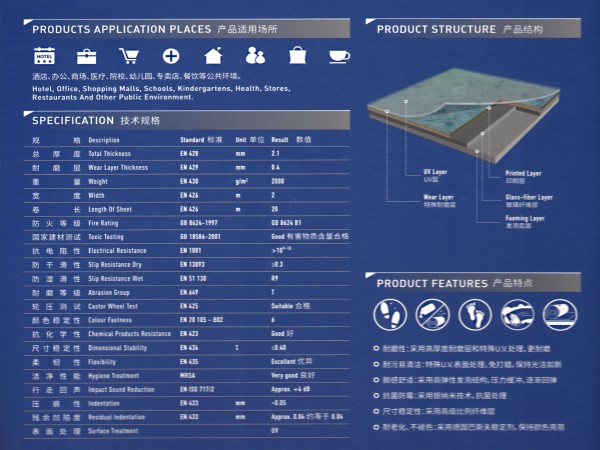 產品性能:高厚度純PVC耐磨層,耐磨耐用,使用壽命長,高回彈泡沫背襯層回彈力優異,高密度玻璃纖維穩定層可避免熱膨脹和冷收縮。特殊表面UV處理工藝易于清洗,無需蠟處理,色彩可塑性很強。不含任何重金屬材料,不含甲醛,不輻射對人體健康不會造成任何危害,非常環保。