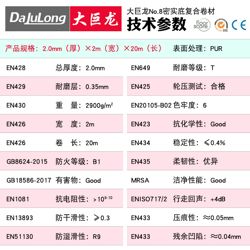 大巨龍(long)NO.8塑(su)膠地板規格(ge)參數:20m×2m×2.0mm 耐磨層(ceng):0.35mm 重(zhong)量(liang):2900克/平米 防火(huo)等級(ji)B1