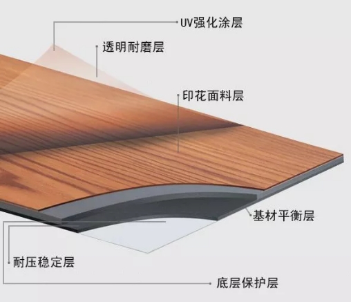 這是石塑地板的產品結構,表面耐磨層厚度決定了產品使用場合和壽命