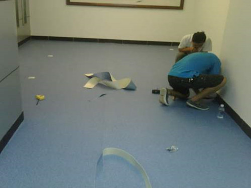 4.粘貼:待膠水達到可以粘接的程度后,將卷材地板一條一條平推下去,然后使用大壓輥滾壓,壓實為止。